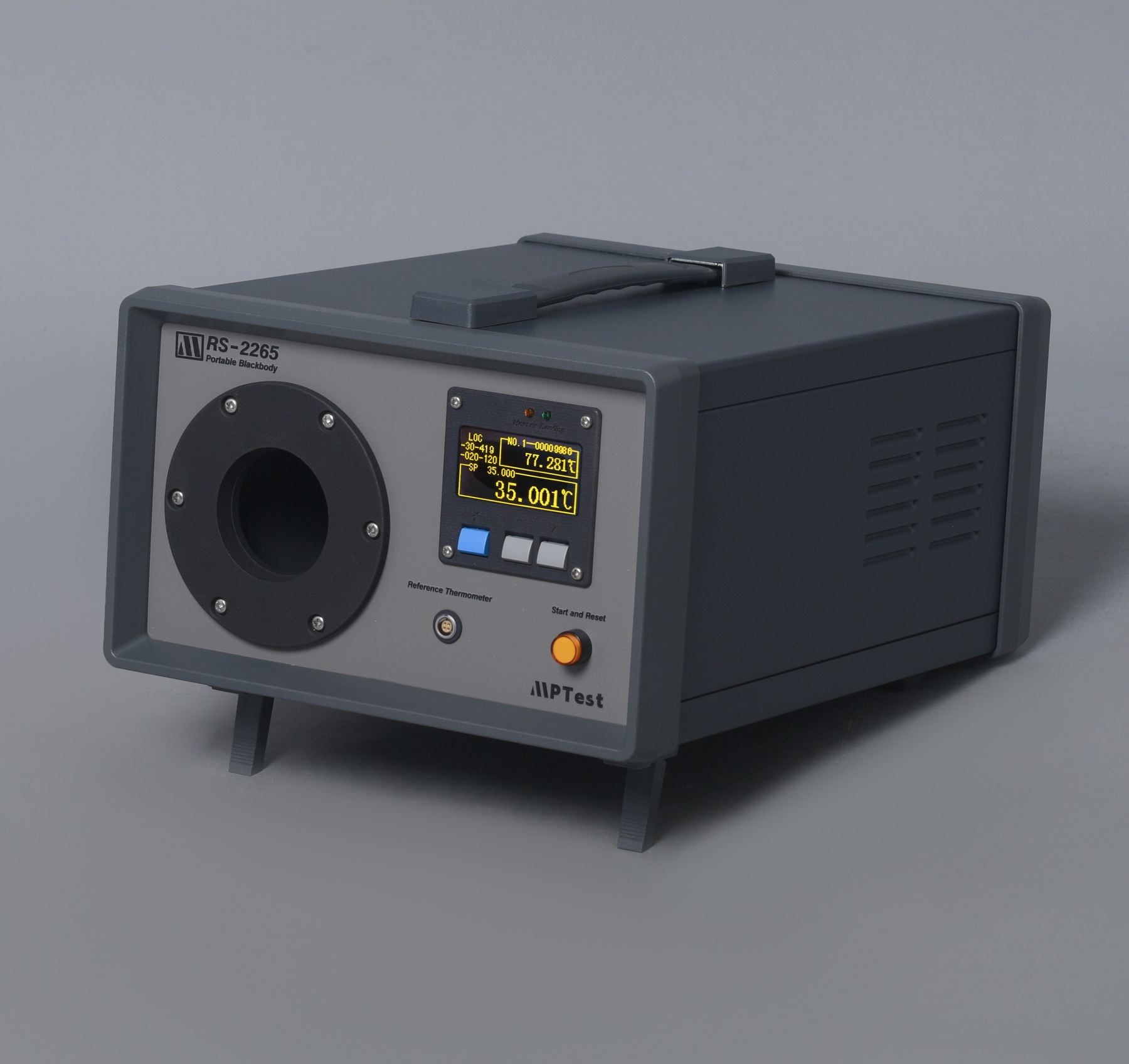 The RS-2265 is a portable standard blackbody source that integrates a standard forehead-temperature blackbody cavity into a sealed container utilizing water or antifreeze circulation for temperature control. This design achieves temperature field uniformity effects comparable to those of a temperature-controlled bath, with an effective emissivity reaching 0.999 or higher. The device features a 4mm diameter test port for temperature calibration and a 4-wire reference thermometer input port to facilitate temperature value traceability.